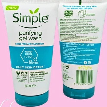 ژل شستشوی Purifying ، یک شوینده ملایم و در عین حال موثر است که پوست چرب را کاملا تمیز میکند. در ترکیبات این شوینده از عصاره آویشن استفاده شده که با خاصیت آنتی باکتریال از ایجاد جوش جلوگیری میکند. وجود نارون کوهی در این ژل شوینده نیز چربی پوست را کنترل میکند و باکتریهای مولد آکنه را از بین میبرد. در عین حال وجود این ماده باعث شده تا ژل شستشوی خاصیت ضد التهاب و التیام بخش نیز داشته باشد. وجود زینک نیز از دیگر ترکیباتی است که از بروز جوش جلوگیری میکند. در ترکیبات این محصول همچنین از عطر مصنوعی، رنگ، الکل و روغنهای معدنی استفاده نشده است و صد در صد گیاهی است. این ژل شوینده نیز مانند سایر محصولات سیمپل بدون تست حیوانی و وگان تولید شده است.