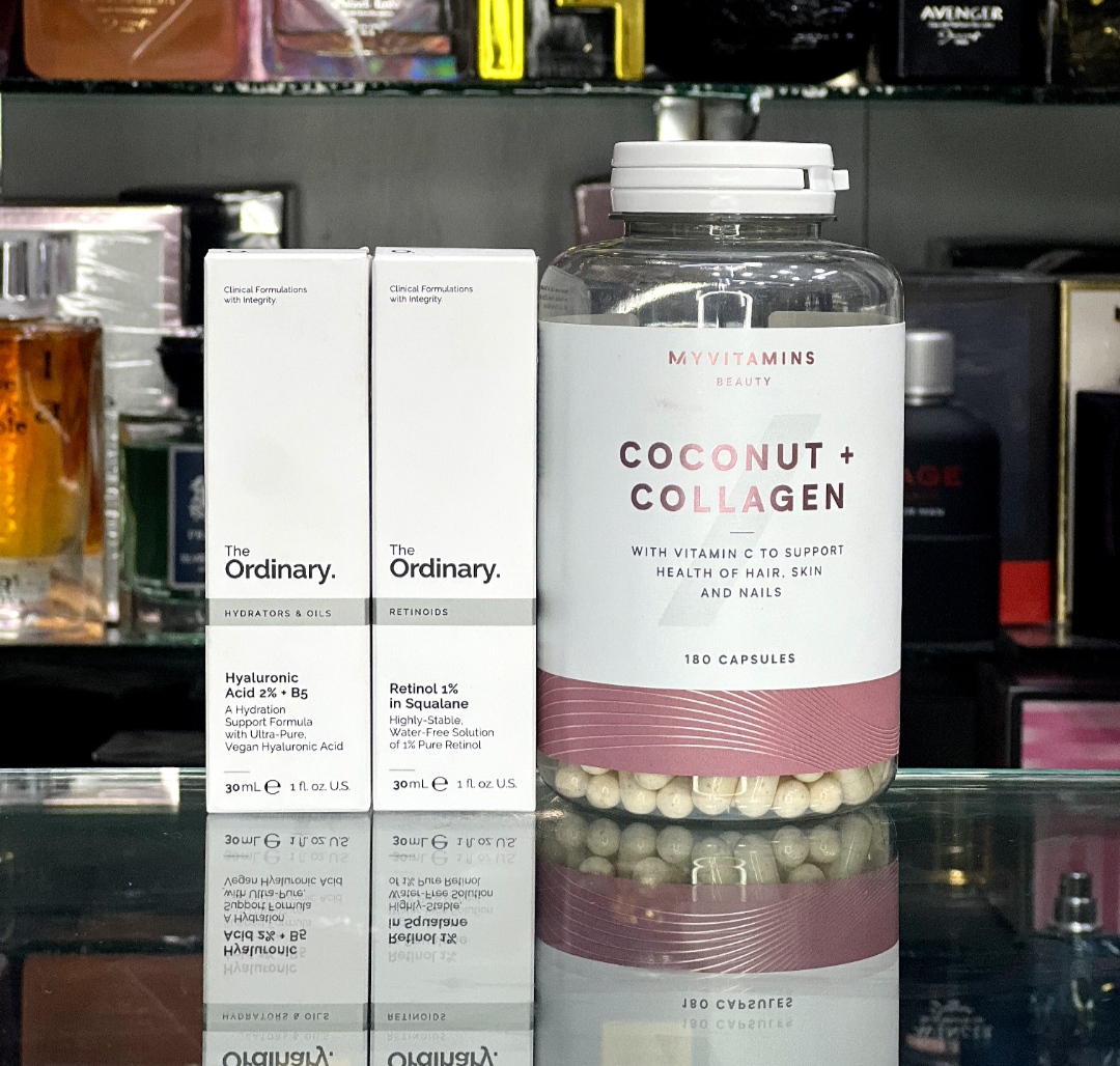 پک ۳عددی «کپسول کوکونات کلاژن مای ویتامینز 180 عددی» و«سرم ضد چروک رتینول 1 درصد دی30 میل» و«سرم آبرسان و ضد لک آلفا آربوتین 2% + هیالورونیک اسید حجم 30 میل»