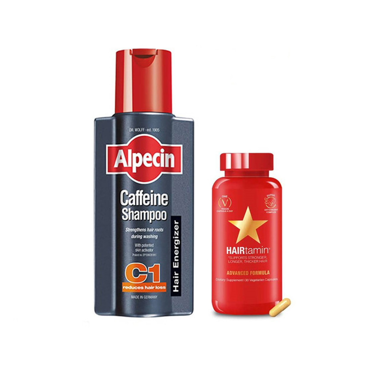 پک شامپو ضد ریزش کافئین C1 آلپسین 250 میل و هیرتامین کپسول تقویت کننده مو 30 عددی